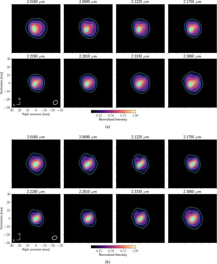 **Methods.** We used GRAVITY interferometric observations in the K band obtained during two different epochs over 2018. Those data were analyzed using parametric models and image reconstruction of both the pseudo-continuum and the CO band heads observed. The reported data are the highest angular resolution observations on the source in the K band.